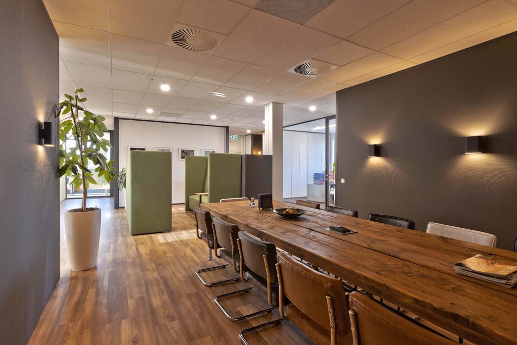 Met het nodige gepuzzel is het gelukt om de ruimte optimaal te benutten. Zo is een plezierige en sfeervolle werkplek gecreëerd, waarbij de aanwezige toegangsbeveiliging zo goed als onzichtbaar is weggewerkt. En dat was precies de bedoeling.